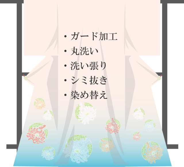 着物を解かずに丸洗いします。ドライクリーニングの技術を和服に応用し、揮発系溶剤で洗うので、油汚れや皮脂、ファンデーションの汚れを落とすのに有効です。